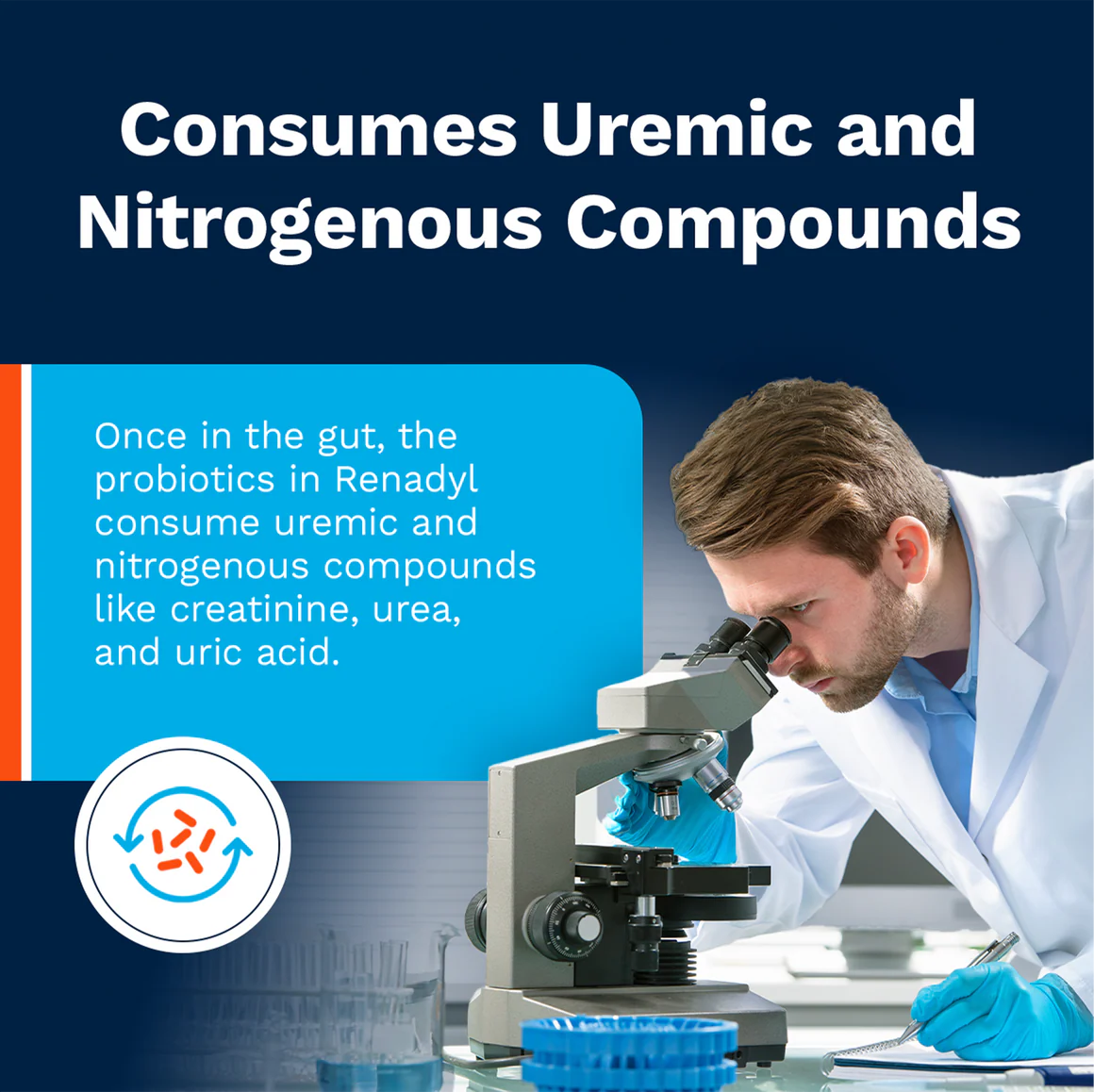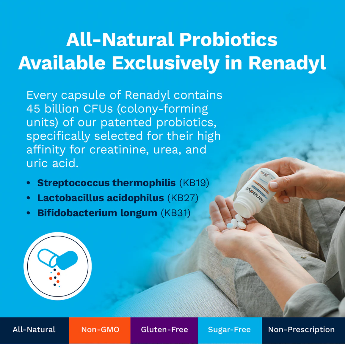 RenadylTM: A Natural Supplement for Kidney Health RenadylTM is a highly effective probiotic supplement that contains 45 billion live probiotic bacteria per capsule. RenadylTM is 100% natural and enclosed in an acid-resistant capsule to ensure that the probiotic bacteria are not destroyed by gastric or bile acids before they are released into the bowel. Renadyl, a natural supplement for kidney health, metabolizes nitrogenous wastes that have diffused from the bloodstream into the bowel. Nitrogenous wastes are utilized by the unique blend of probiotics found in Renadyl as their nutrients. As these probiotics grow and multiply, they consume more nitrogenous waste and can reduce the serum uremic toxin levels in patients with compromised kidney function. Dosage and Administration With the improved Renadyl™ formulation, take 1-2 capsules twice daily with a meal, or as suggested by your healthcare professional. It is important to note that Renadyl™ should be used for a full 3 months to receive its full benefits. Side effects or Reactions Probiotics are generally regarded as safe for consumption. The gel cap product is more efficacious when taken immediately after each meal. Side effects, if they occur, are mild (such as gas or flatulence) and usually disappear after 2 or 3 weeks of continuous usage. Our product is manufactured in a cGMP facility that also process products containing peanuts, treenut seeds, grains, eggs, crustacean and dairy products *FDA Statement These statements have not been approved by the Food and Drug Administration. This product is not intended to diagnose, treat, cure, or prevent disease. Results may vary.