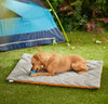 (1) dog bed, (1) cushion (2) stainless steel bowls